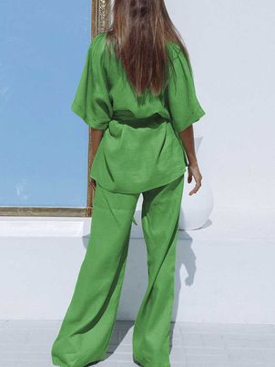 - Design : Ensemble deux-pièces. Haut style cache-cœur à manches amples et pantalon palazzo fluide.