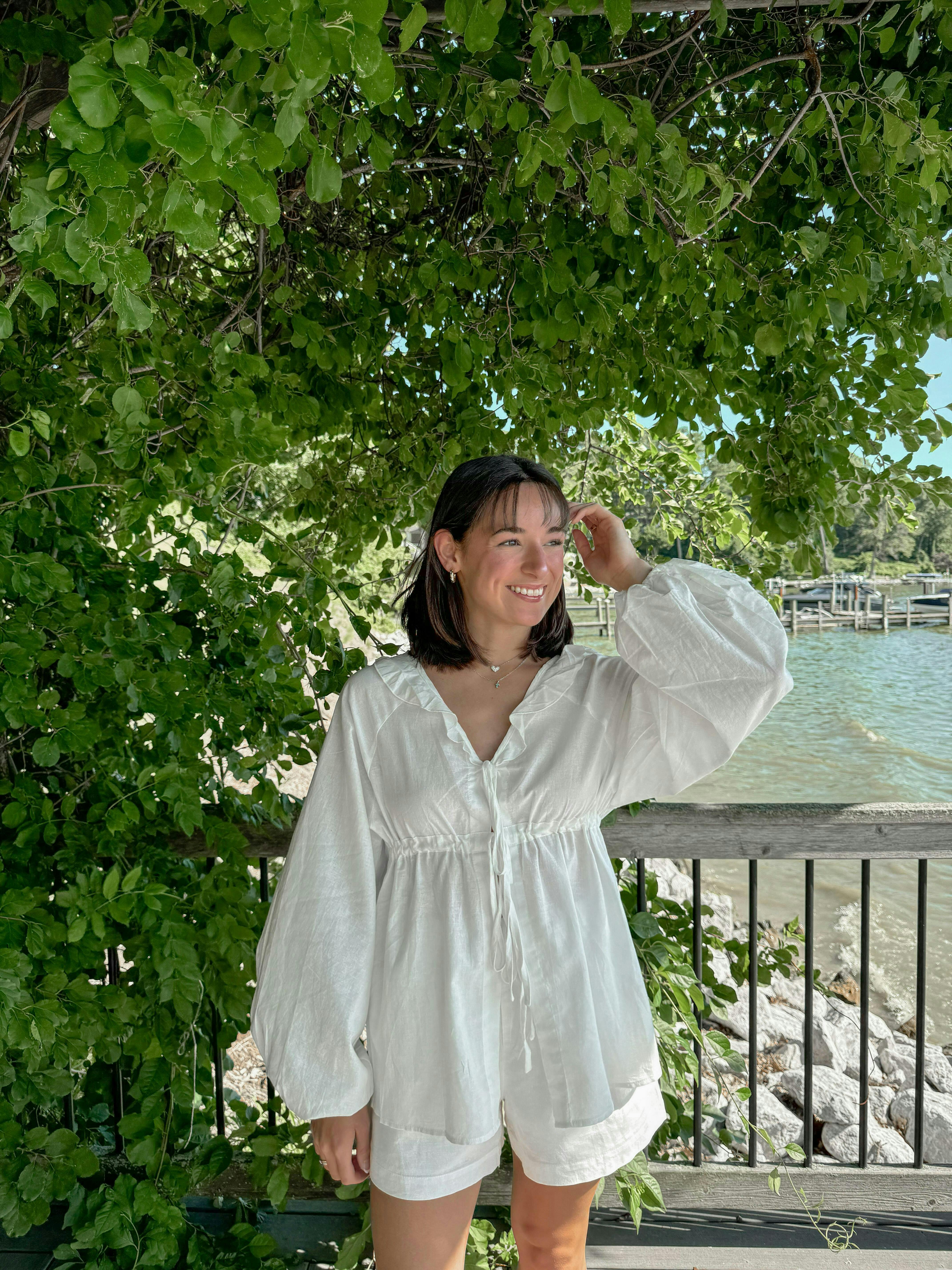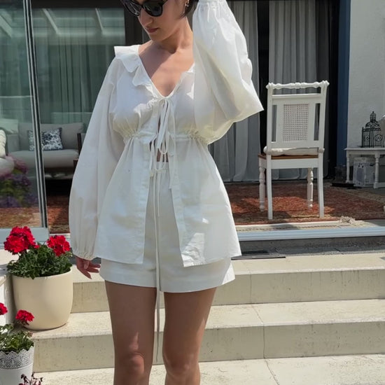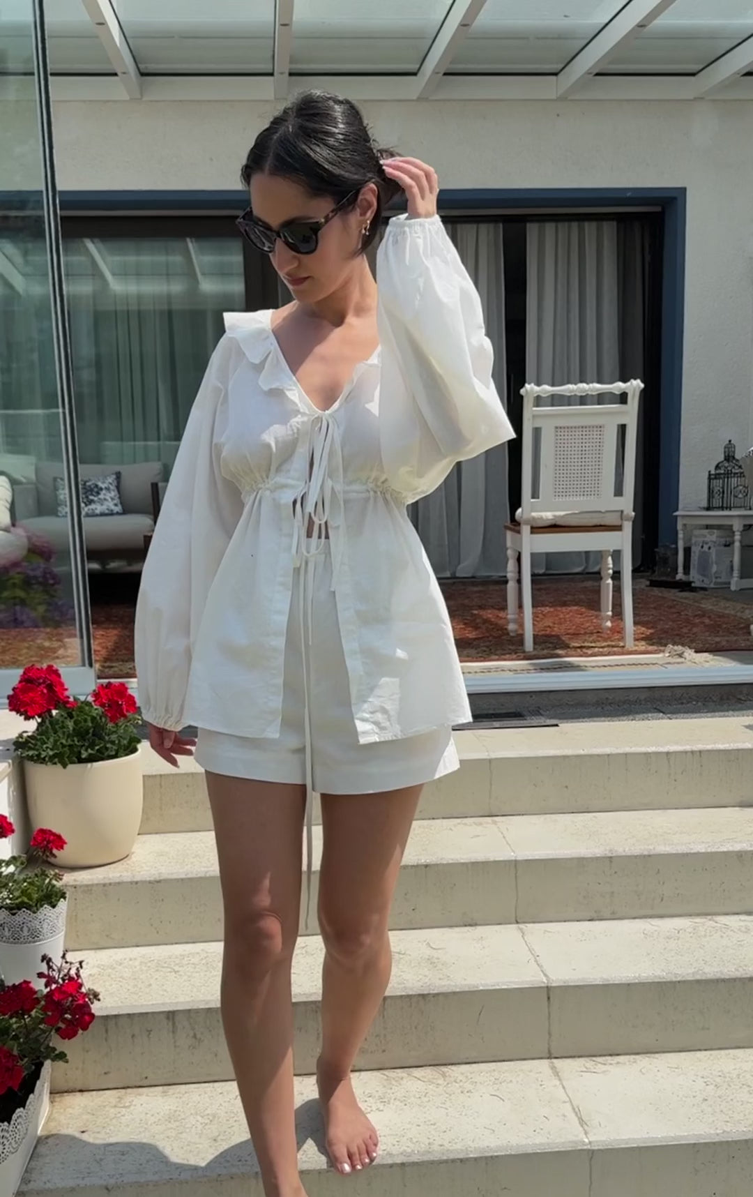 Laissez-vous séduire par la caresse de ce duo en coton et lin, votre allié pour une élégance sans effort. Sa blouse vaporeuse à volants et son short assorti dessinent une silhouette féminine et libre, parfaite pour flâner au soleil ou pour une soirée d'été improvisée. Vous ne le portez pas, vous le vivez.