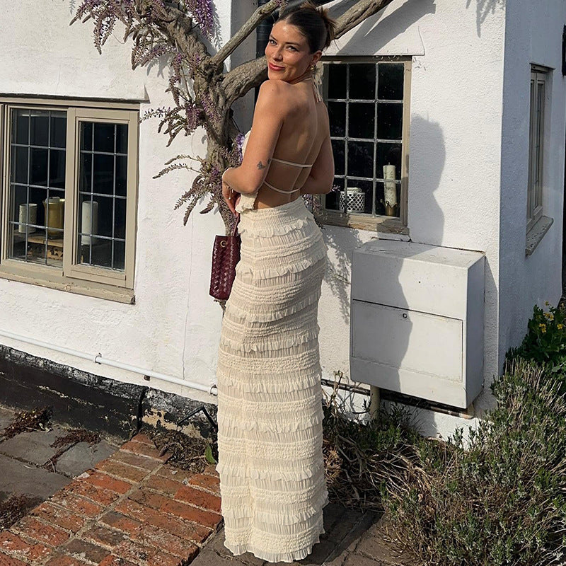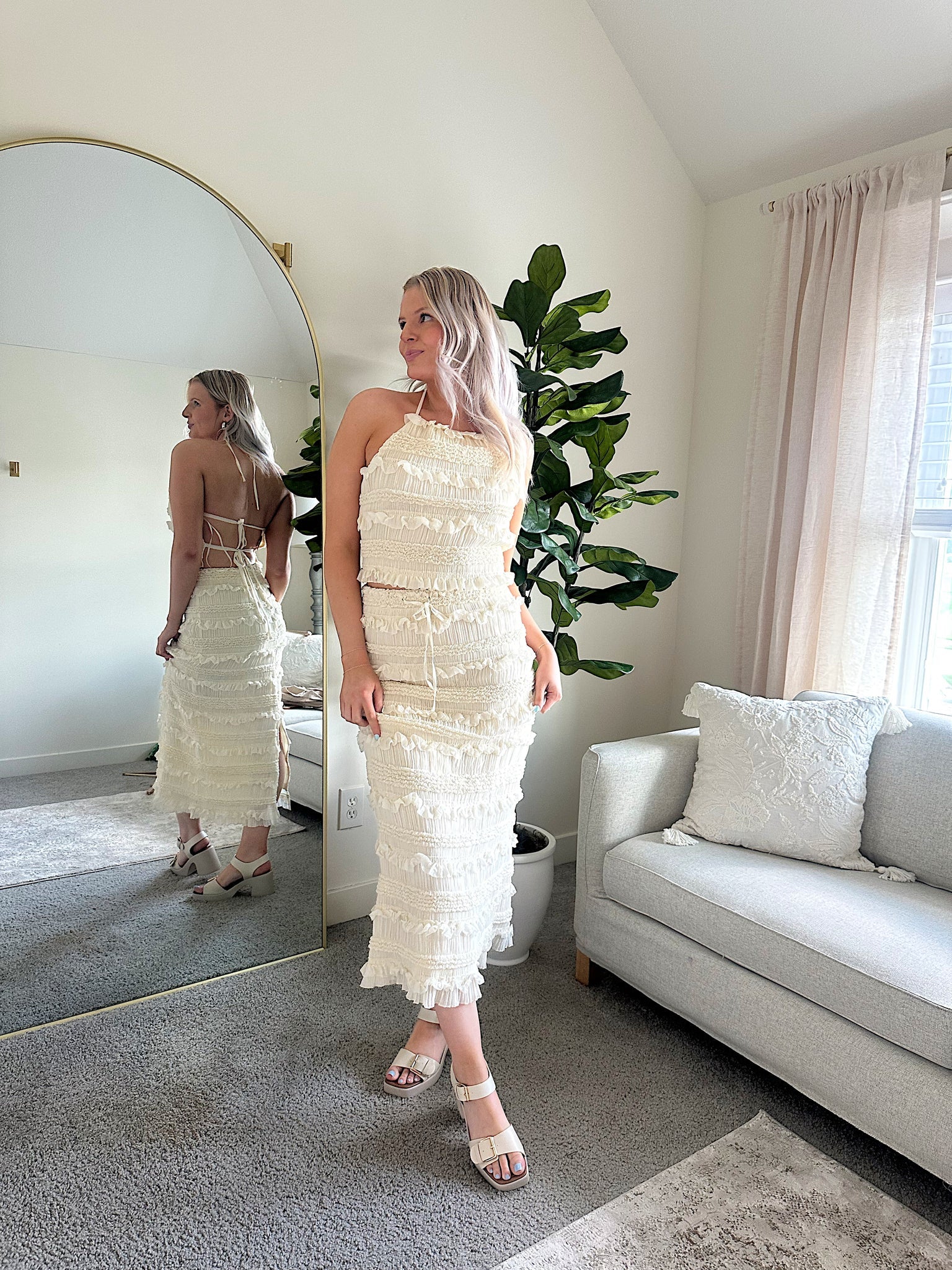 Le top à col licou dégage élégamment les épaules pour une touche de sensualité subtile, tandis que la jupe longue assortie tombe avec une grâce fluide. L'ensemble, avec son effet plissé texturé sur toute la surface, flatte la silhouette en allongeant la ligne. Chaque pièce est pensée pour être aussi confortable que spectaculaire.