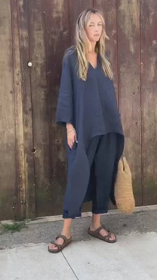 La tunique, avec son col V flatteur et ses manches amples, tombe avec fluidité pour une liberté de mouvement optimale. Les poches discrètes ajoutent une touche pratique et décontractée. Le pantalon assorti, à la coupe également ample et confortable, complète harmonieusement la silhouette pour un look bohème-chic des plus actuels.